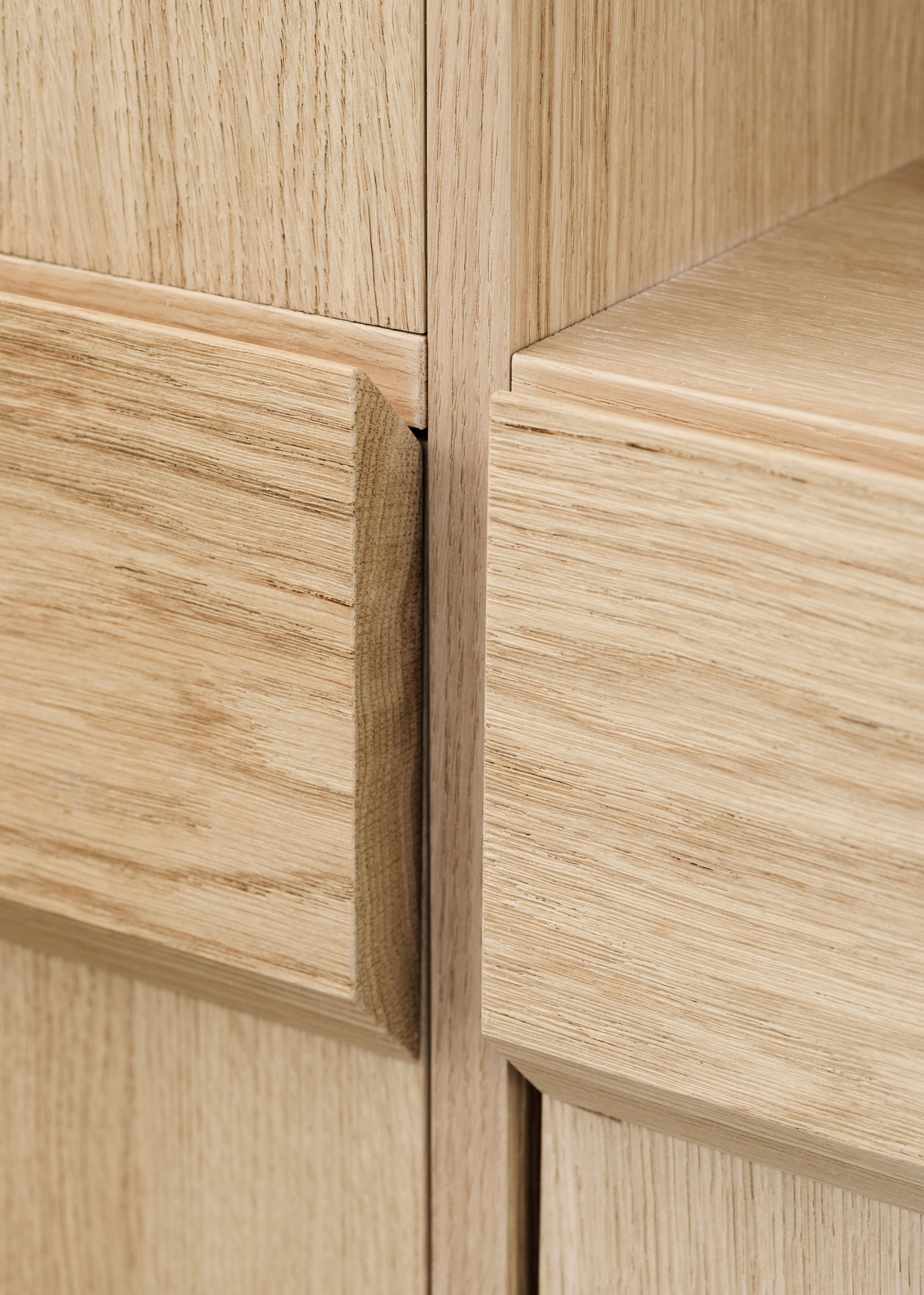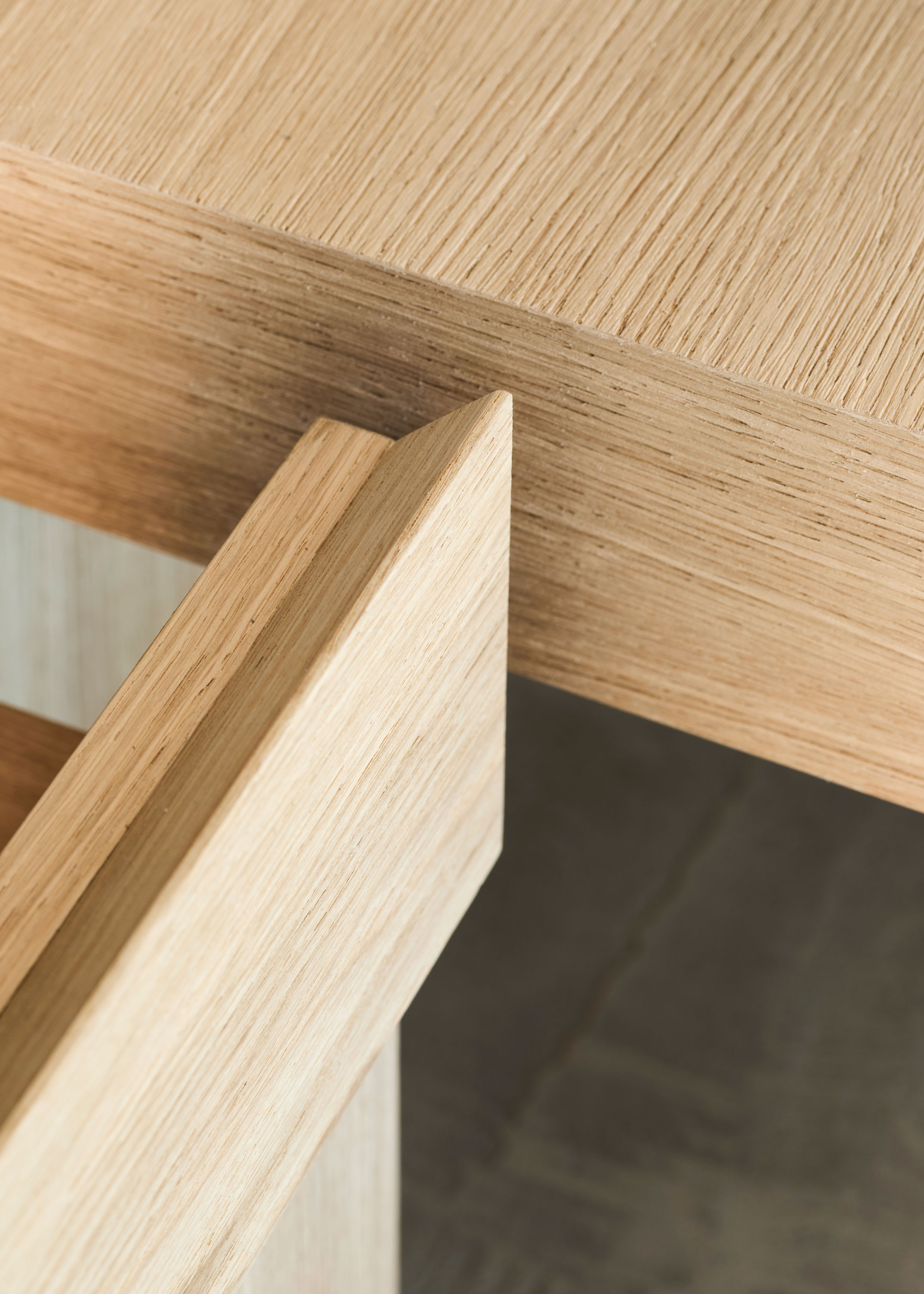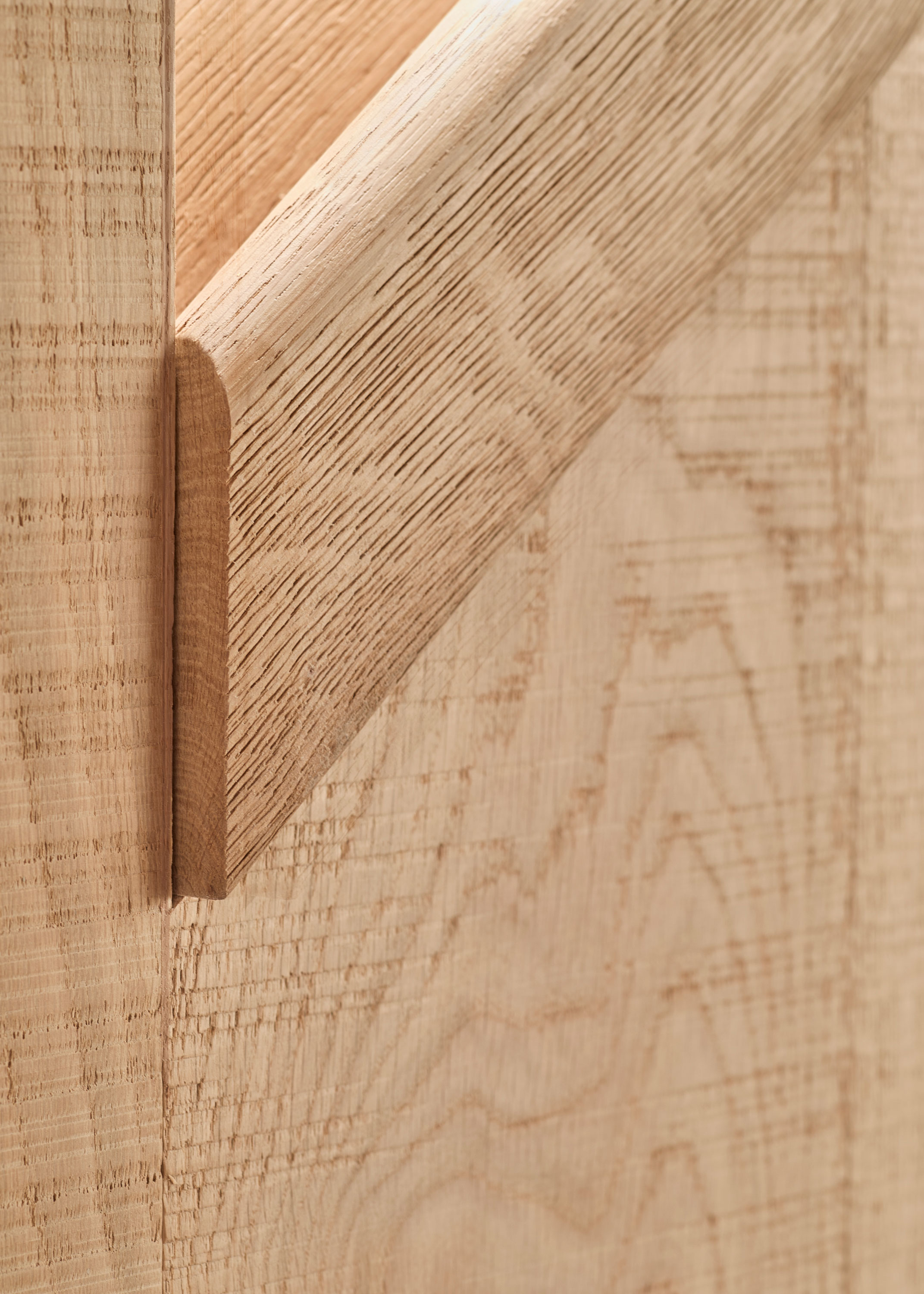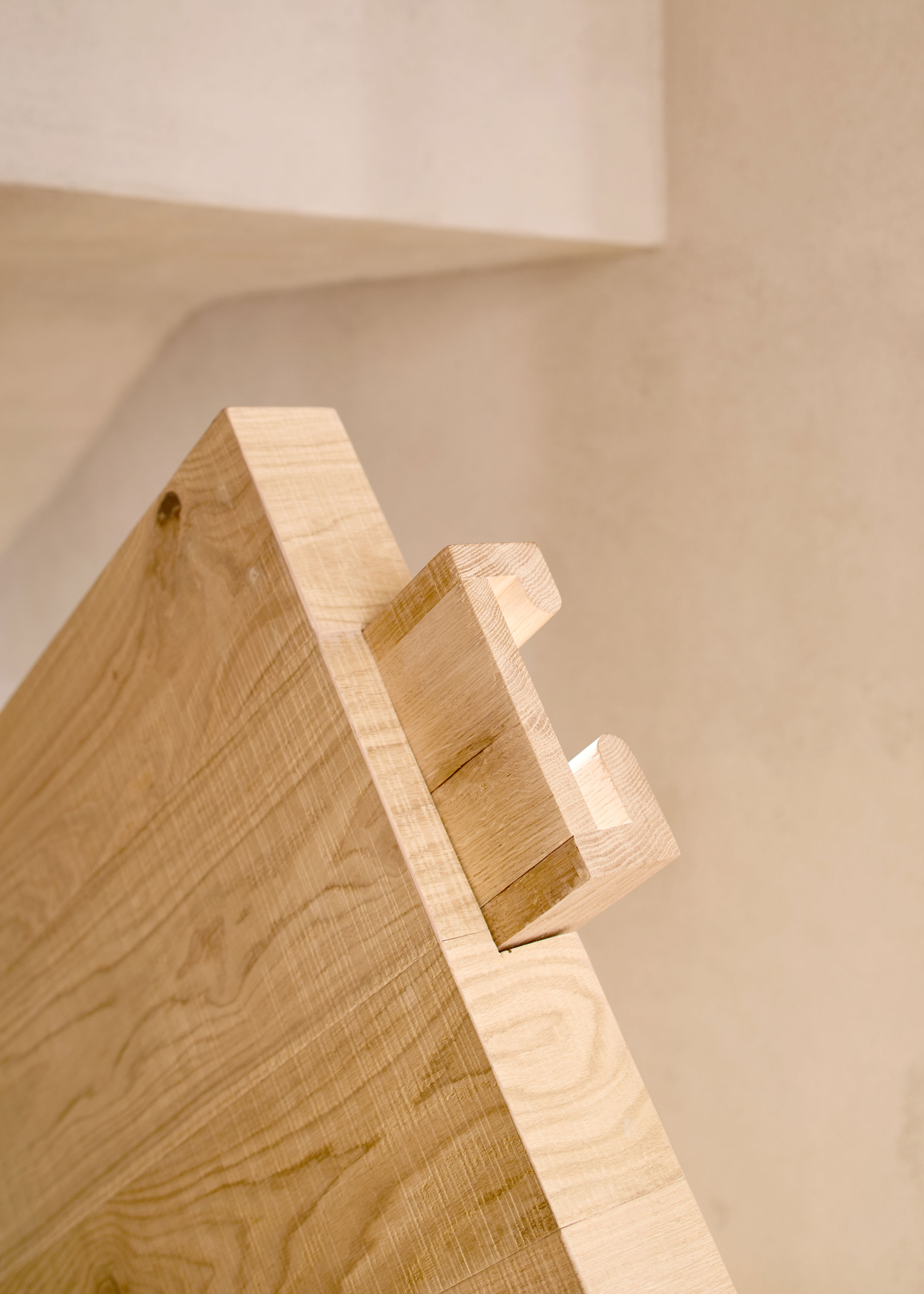The Veragouth and Xilema team followed every step of the way, ensuring that every detail was taken care of with the utmost attention. In this project, wood, with its warm presence, takes on an even more central role: the finely sawn solid oak structures are assembled using construction techniques inspired by the Japanese sashimono technique. The resulting effect is one of light furniture that enhances the texture of the wood. This, in fact, is left raw and pure, without any treatment, thus maintaining its authentic essence and emphasizing its naturalness. This quality contrasts with the coldness of contemporary materials such as polycarbonate, offering a harmonious and balanced result.