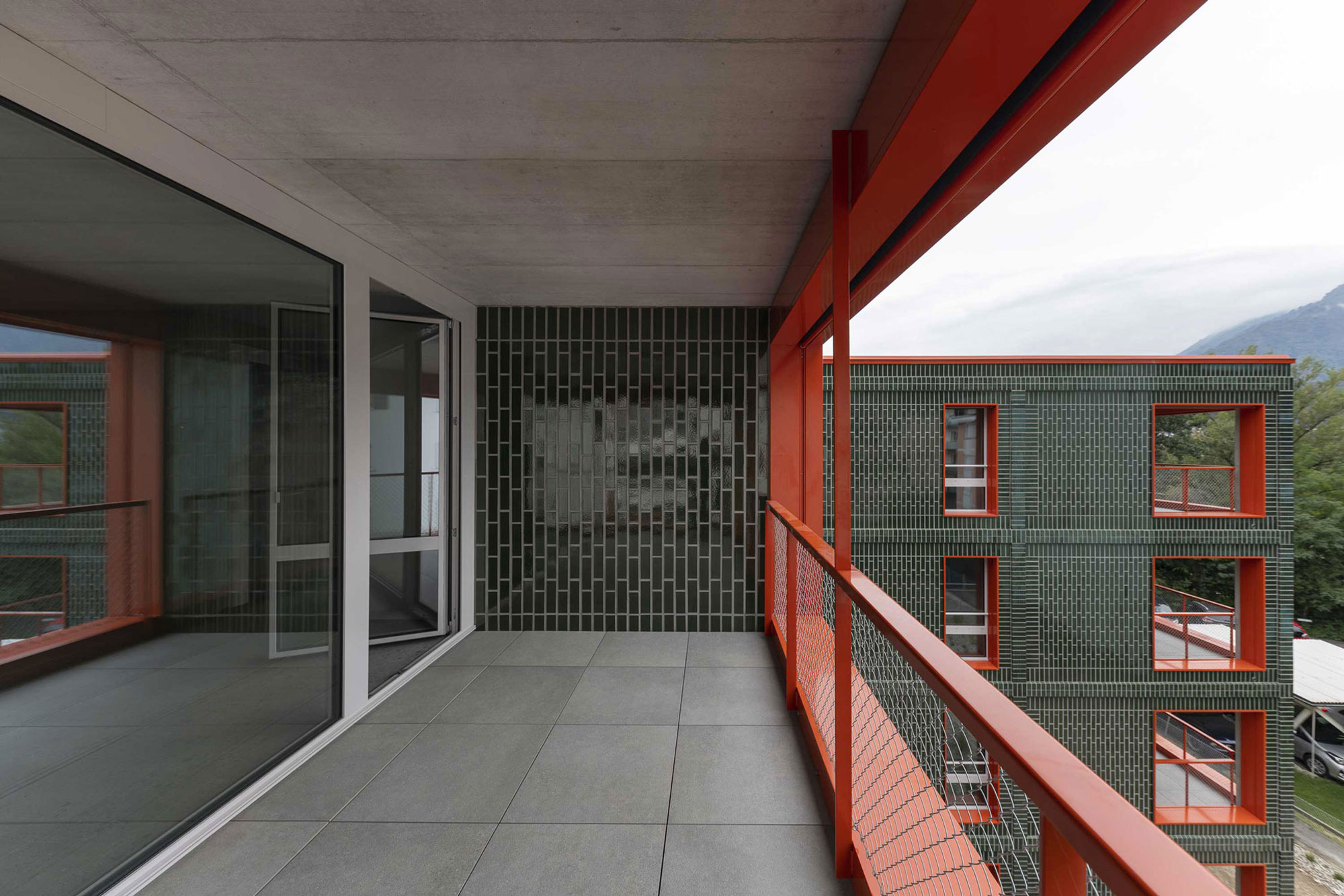 In Solduno's suburban area, used by residents as a community garden, the new construction acts as a permeable link between the neighbourhood and the Maggia river. The impact is reduced by partitioning two identical buildings, creating space between neighbours to grow new gardens, one for each apartment. Central cores, edge pillars and slabs are entirely visible on the inside, and represented by pilaster strips and belt courses on the outside. The internal partitions and the building envelope are light. The facade cladding was made with handcrafted ceramic bricks and tiles. The external doors and windows made by Veragouth and Xilema become an element of strong characterization of the building. The large coplanar windows – thanks to 4B Swiss technology – stand out in contrast to the narrow and angular profile, which offer a primitive minimalism aesthetic effect and a cleanliness of detail emphasized by a strong chromaticism.