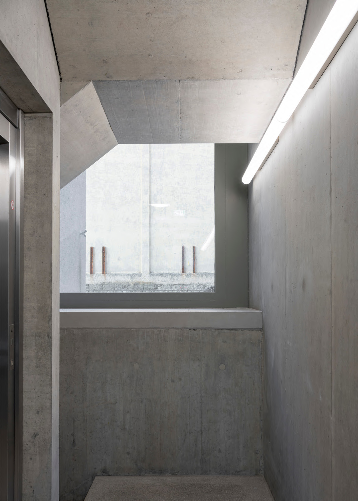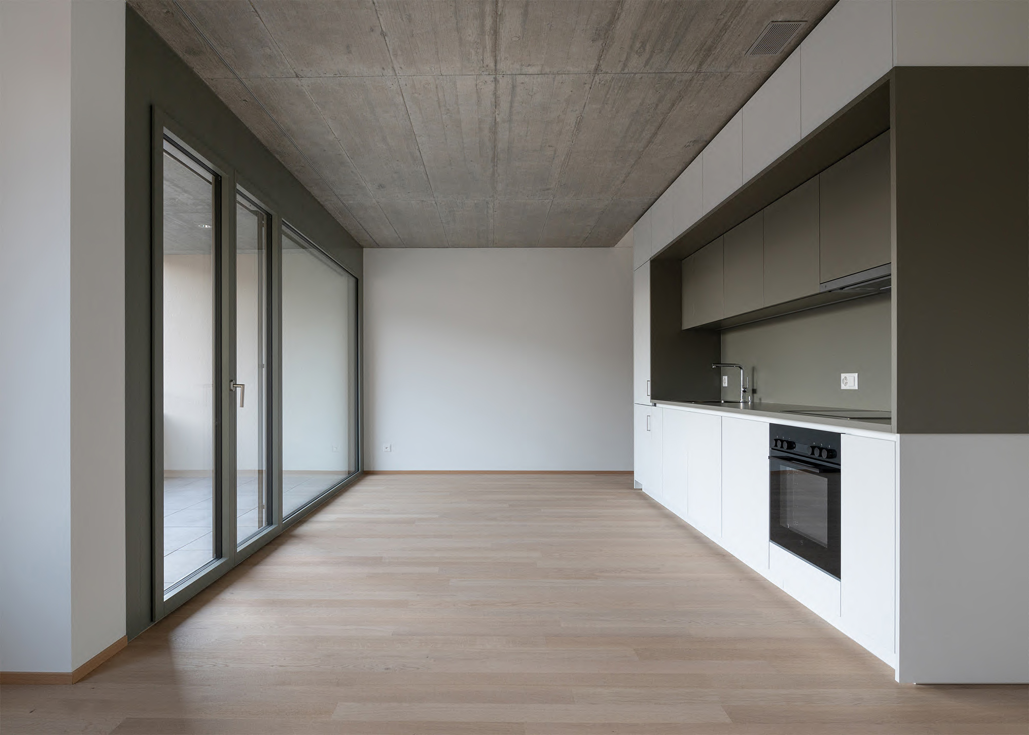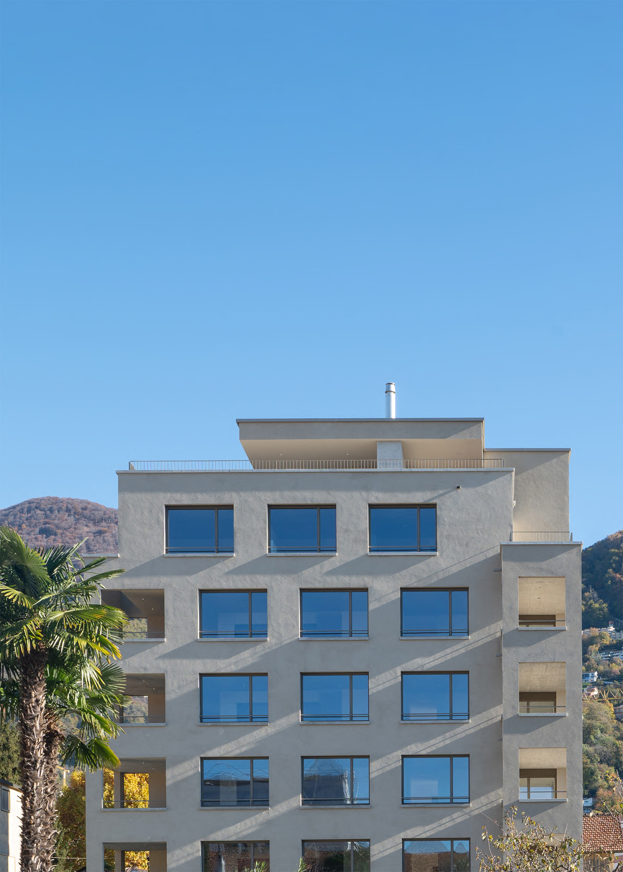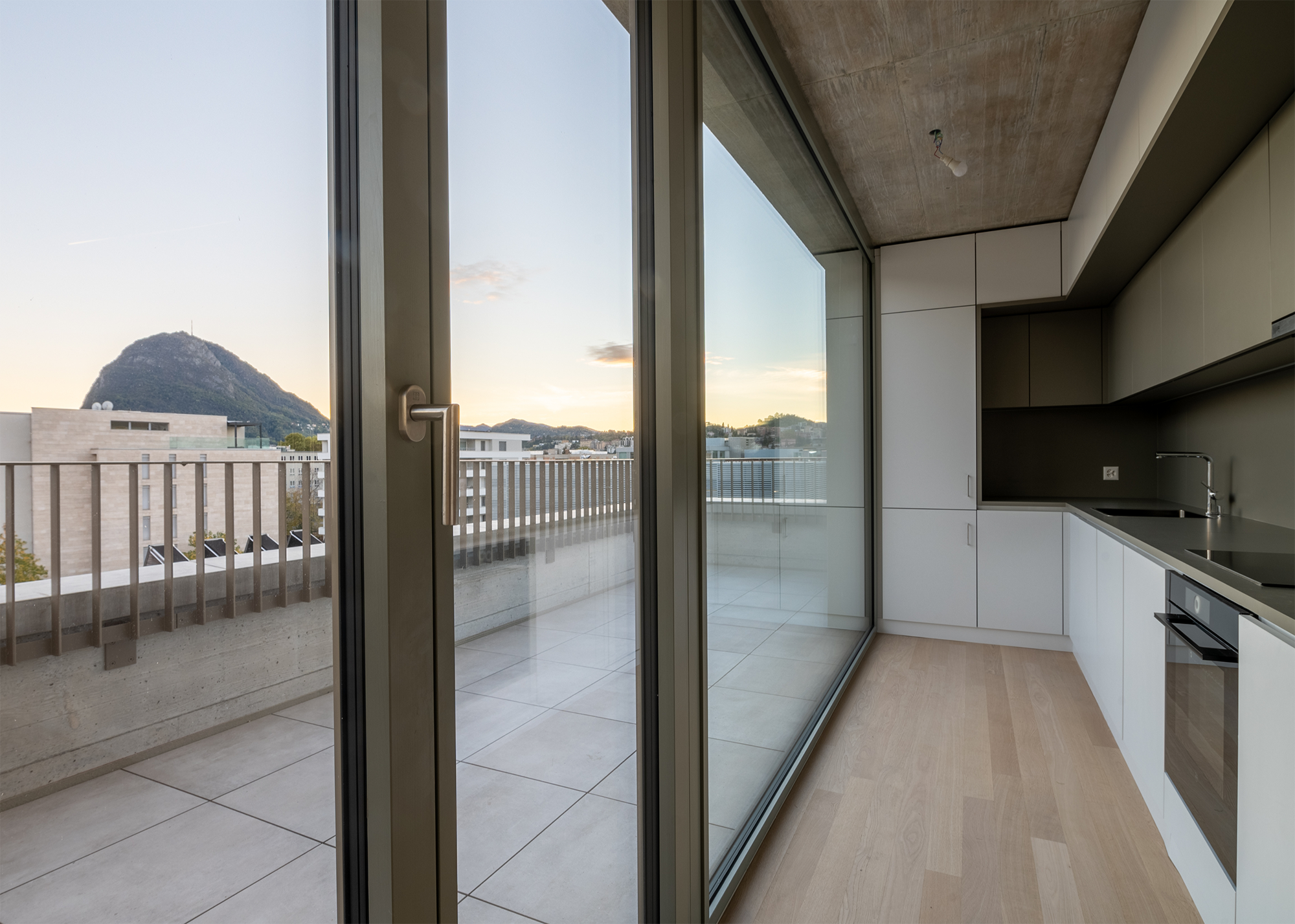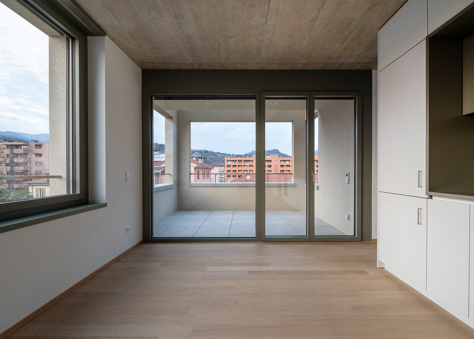 It is a refined stone-clad building for residential use. For Casa Pea the two departments, joinery and commercial, worked in symbiosis. The commercial area dealt with wood/metal and synthetic PVC/metal windows, carpenter's work such as interior wood panelling and glazier's work; the carpentry department, on the other hand, designed a double-sided cladding for the central block of the flat consisting of a laminate kitchen with v-zug appliances and wardrobe cabinets.