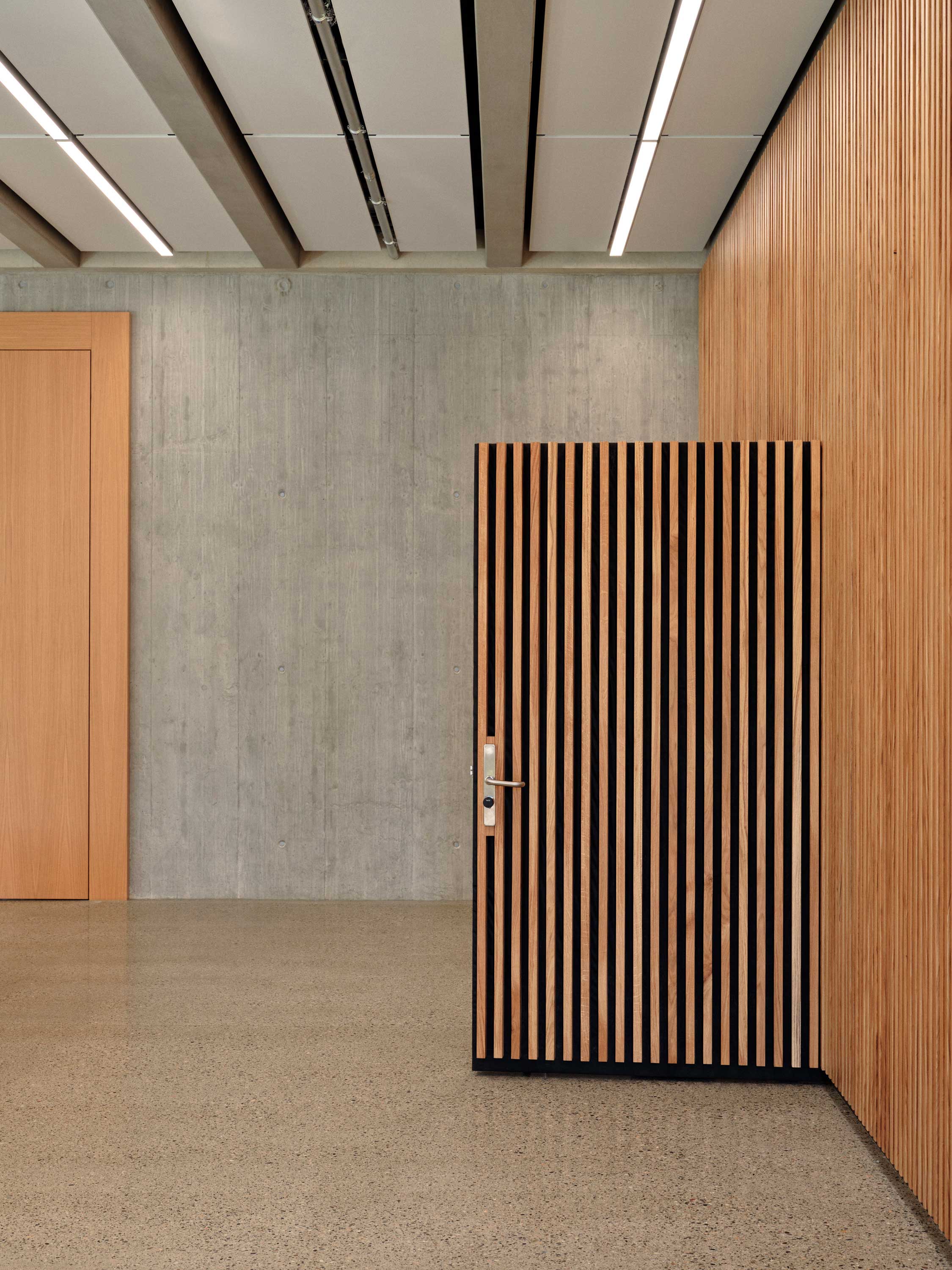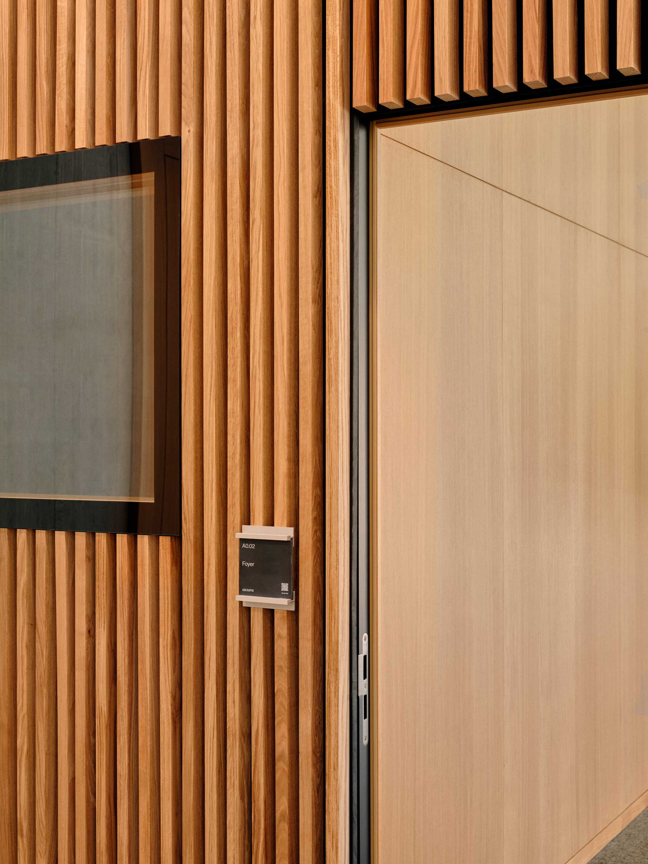 Rivestimenti di porte e pareti in rovere fiammato rigatino, sala conferenze, 700 porte