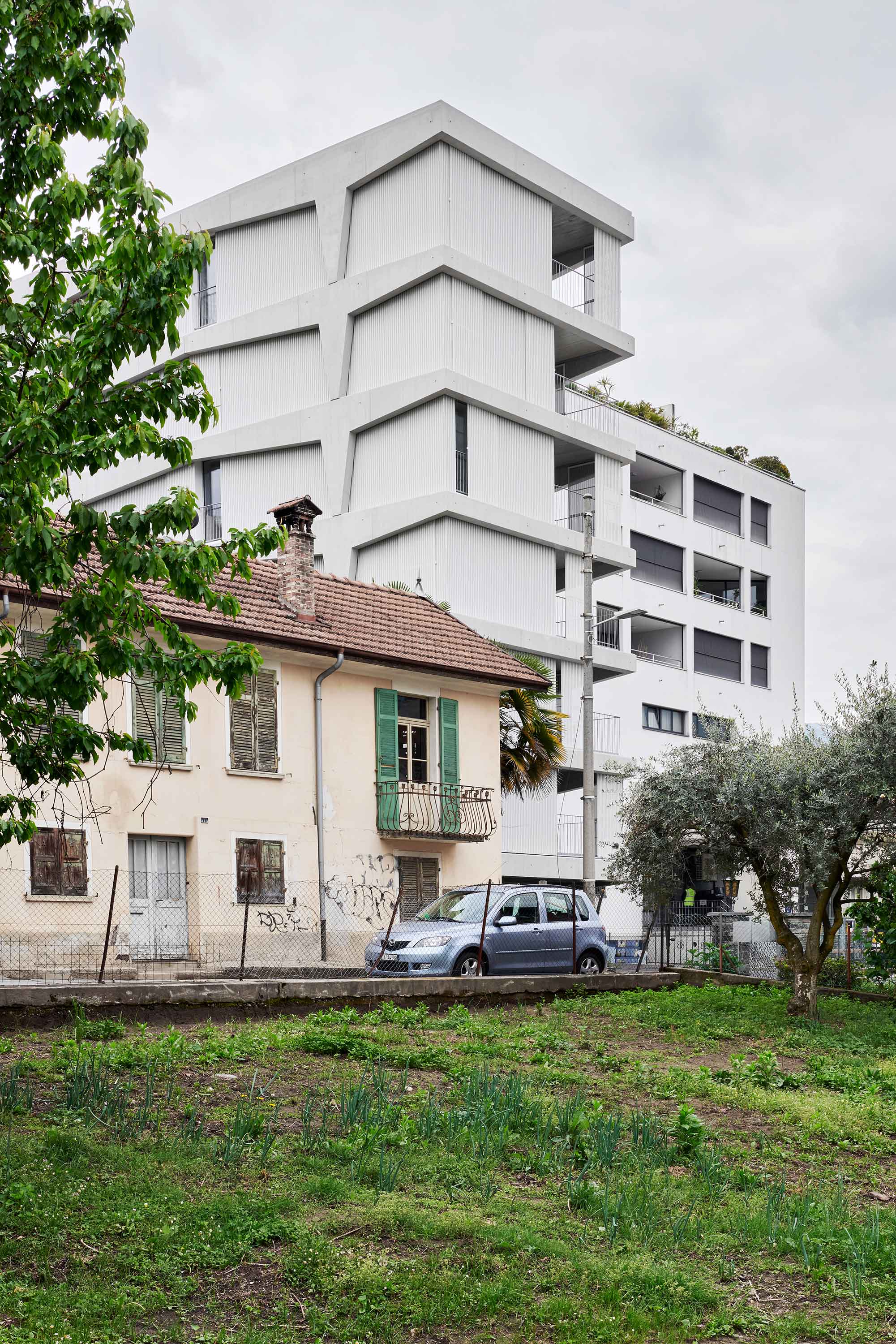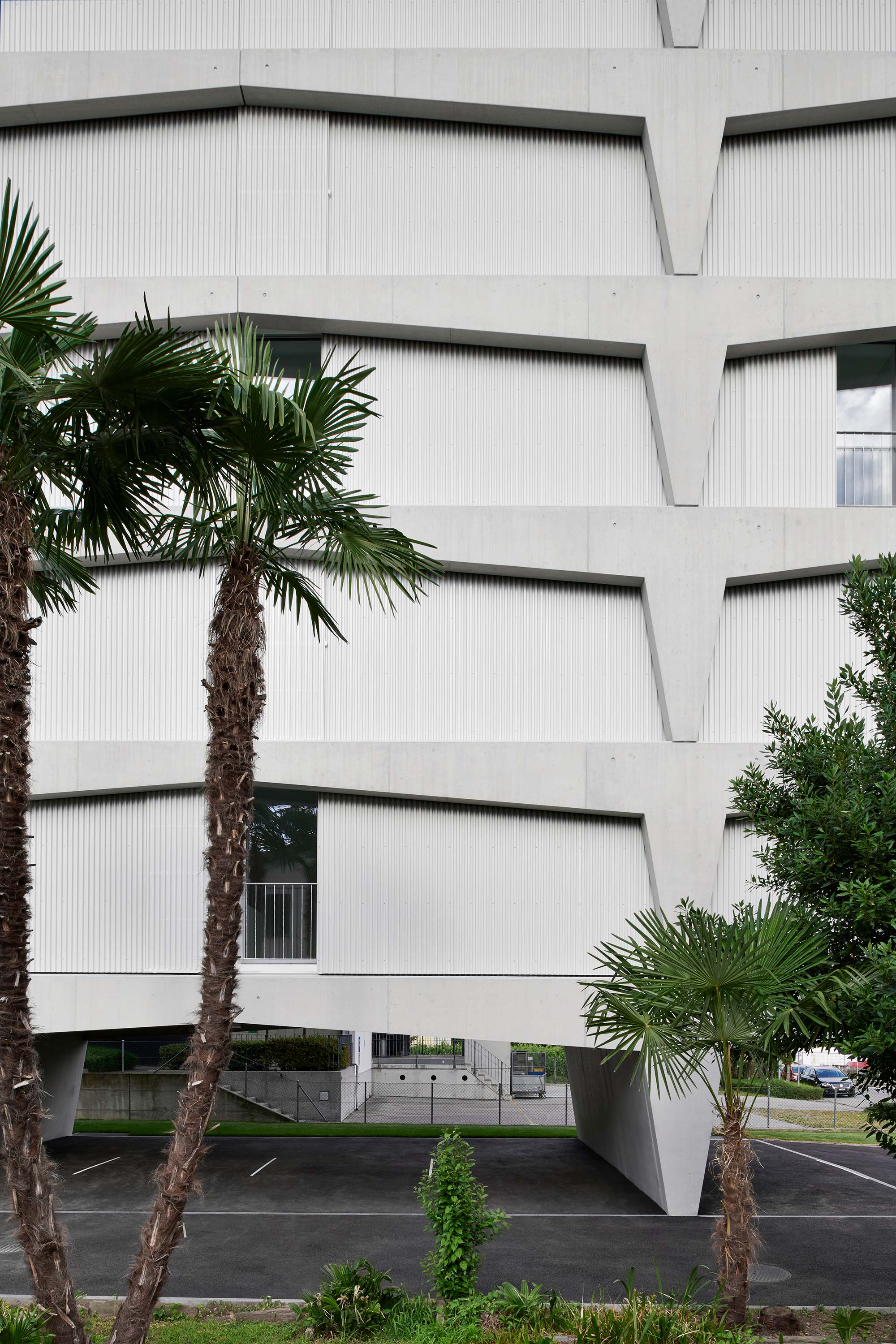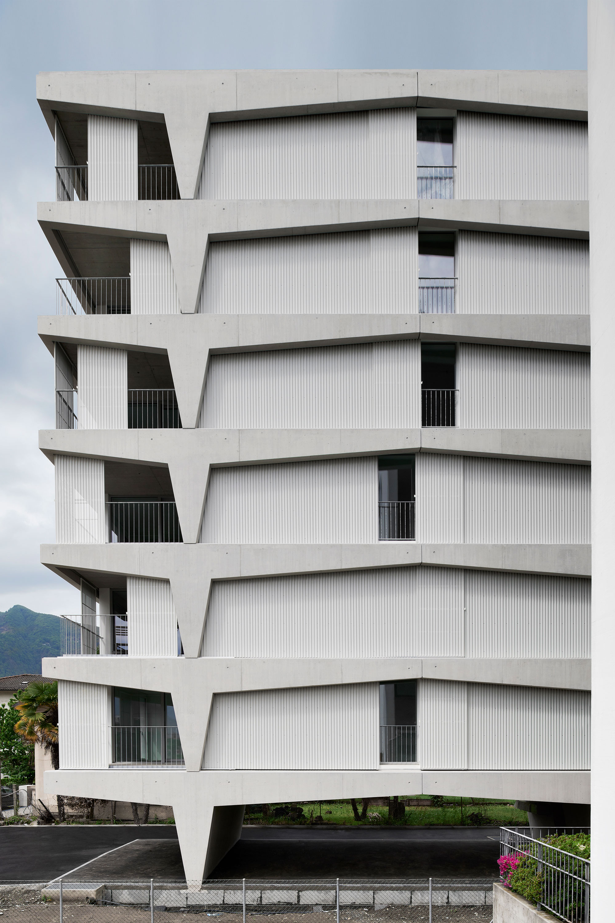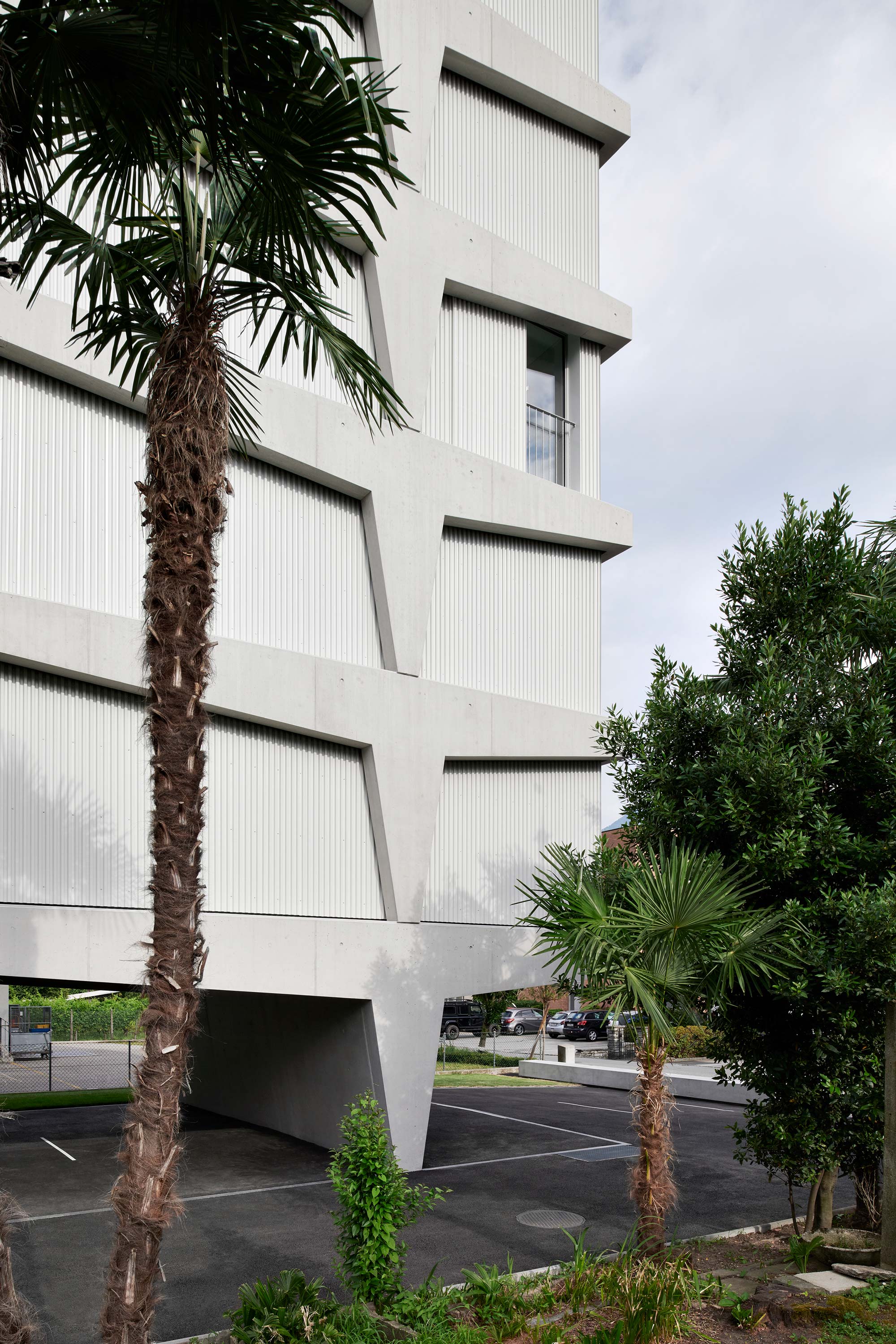 Il palazzo sorge in una zona originariamente agricola e destinata ora alla residenza, alle attività commerciali, di servizio e produttive; è quindi un quartiere misto, in cui le potenzialità edificatorie sono molto alte. L’edificio, che si sviluppa su sei piani e ospita un appartamento per piano, si distingue e caratterizza per il tamponamento prefabbricato perimetrale rivestito in lamiera microforata, un richiamo al carattere semi-industriale e artigianale del comparto urbano e una scelta di modalità espressive moderniste, nel solco dei maestri locarnesi della “Tendenza”.